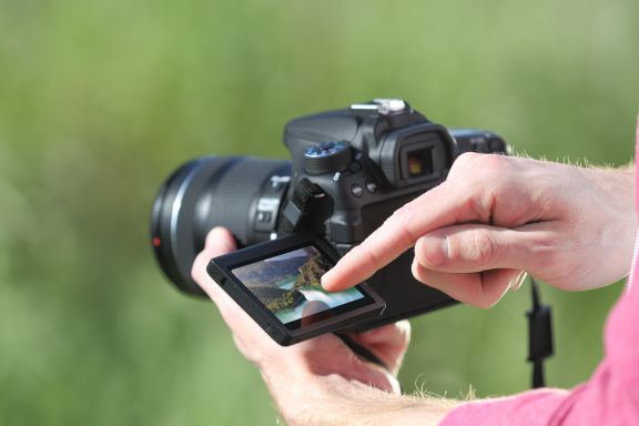 A7,7 cmátlójú, állítható dőlésszögű, 1 040 000 képpontos Clear View LCD II érintőképernyő ideális videók felvételéhez és a szokatlan, izgalmas szögekből történő kreatív fényképezéshez. A képernyő kapacitív típusú, így több ujjal is kezelhető, például lehet két ujjal arrébb „söpörni” vagy „csípve” kicsinyíteni-nagyítani a képeket.