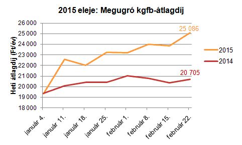 Az év elején még a 2014-i évkezdethez hasonló szinten állt a személyautók kgfb-átlagdíját mutató index, azonban az idei díjgörbe eddig teljesen eltérő pályát mutat a tavalyitól: tavaly január-februárban végig a 20–21 ezer forint közötti sávban maradt a mutató, február második felére már a 25 ezres szintet is sikerült áttörnie.