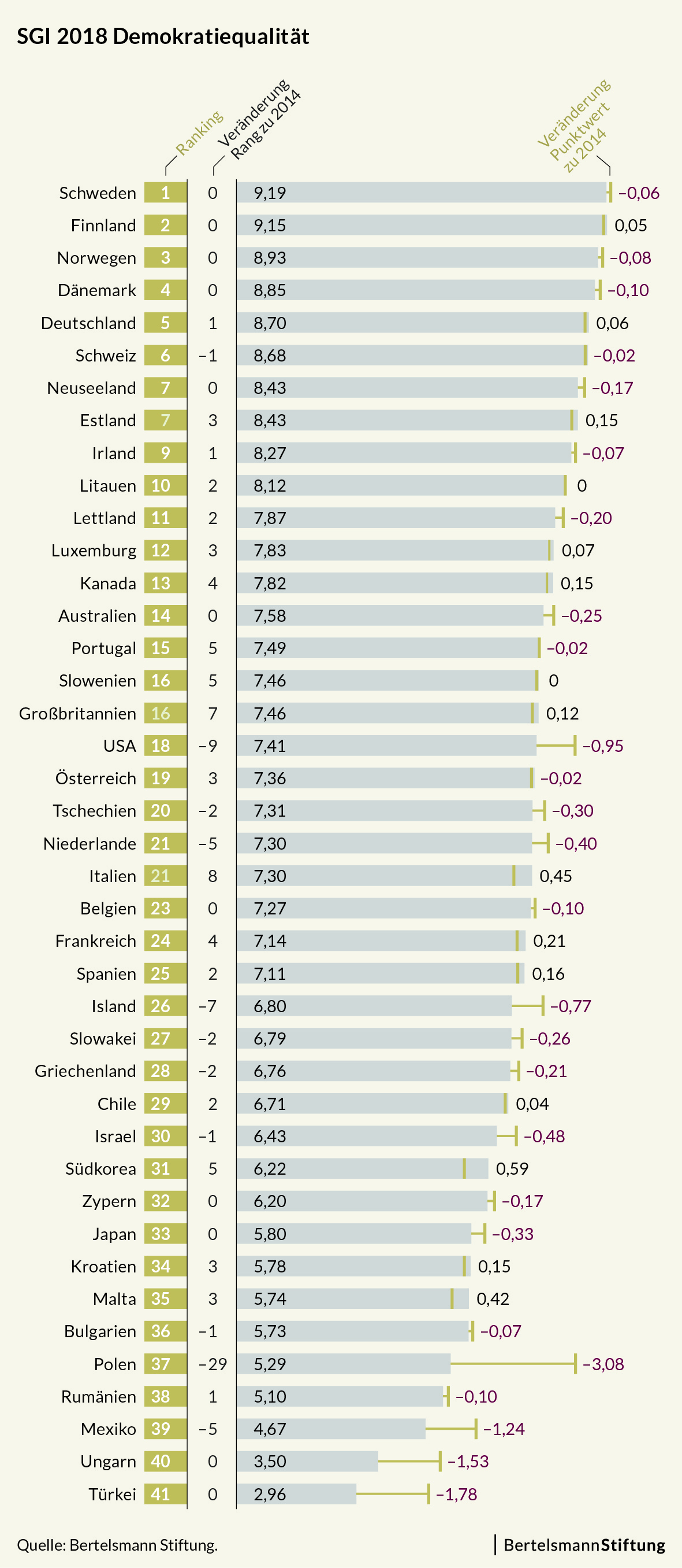 A 41 ipari országra kiterjedő felmérés összességében is meglehetősen sötét képet fest arról, hogy milyen a demokratikus normák helyzete a nyugati világban: 26 országban állapították meg a demokrácia szintjének a romlását a Bertelsmann által 2014-ben végzett hasonló felmérés óta. Egy országban nem látszik változás, és csak 14 országban javult a helyzet. A demokrácia minőségét illetően az első öt helyen a négy észak-európai ország – Svédország, Finnország, Norvégia és Dánia, valamint Németország található.