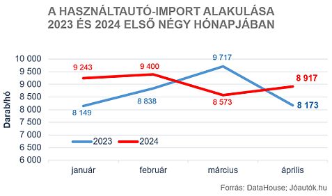 Áprilisban a DataHouse adatai szerint 8917 import használt személyautó kapott hazai rendszámot, csaknem tizedével több, mint egy évvel ezelőtt. Az év eddigi részének számaiból ugyanakkor az látszik, hogy az import mértéke továbbra sem igen mozdul a havi 9 ezer közeléből.