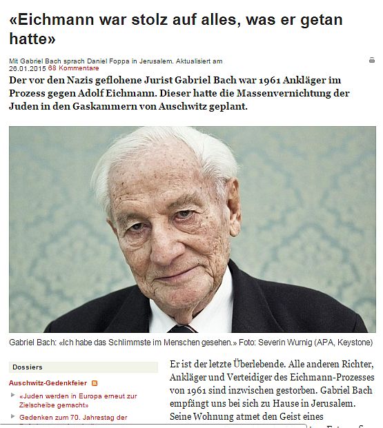 Basler Zeitung: – Adolf Eichmannt 1960-ban fogták el Argentínában, és vitték Izraelbe. Ön a haifai börtönben beszélt vele első ízben. Ez hogyan játszódott le?