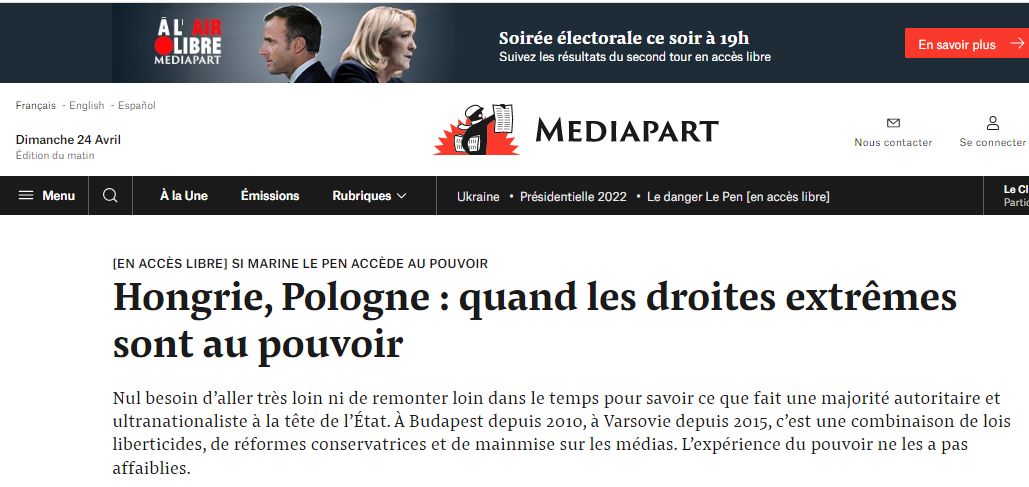 Mediapart Magyar- és Lengyelország mutatja, milyen is az, amikor a szélsőjobb van uralmon. Azaz a franciáknak nem kell messzire menniük, illetve visszakanyarodniuk az időben, ha tudni akarják, mit csinál egy tekintélyelvű és ultranacionalista többség, ha kormányra kerül. Budapest és Varsó elegyíti a szabadságellenes törvényeket, a konzervatív reformokat és a sajtó megkaparintását. De ez egyiküket sem gyengítette meg.