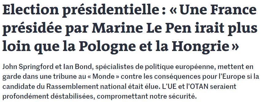 A szerzők rámutatnak: a magyar és a lengyel kormány nem hajtja végre az Európai Bíróság határozatait, és nem tesz eleget azoknak a közösségi törvényeknek sem, amelyek nem felelnek meg nekik. És ha mindehhez még a jelenlegi kihívó lenne a franciák elnöke, akkor abból csak teljes politikai zűrzavar alakulna ki a földrészen. Még akkor is, ha Párizs rövidtávon nem válnék ki sem az EU-ból, sem az euróövezetből.