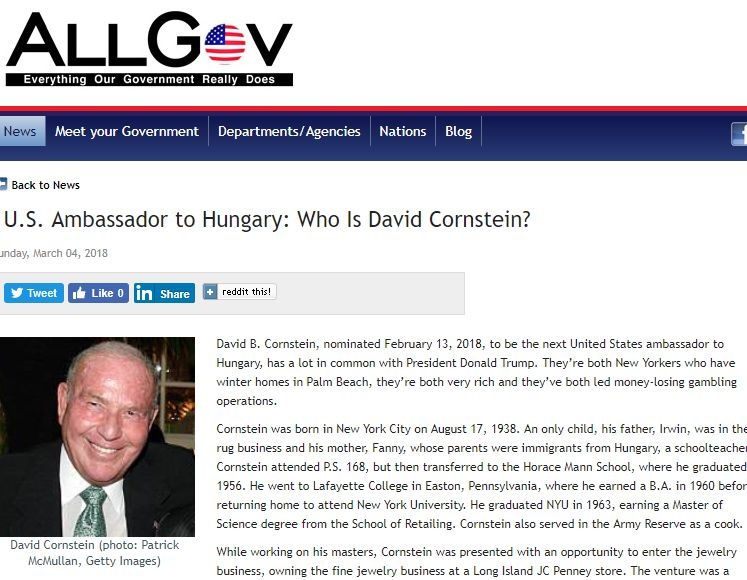 David B. Cornsteinban és Donald Trumpban sok közös vonás van. Mindketten New York-iak, mindkettejüknek a floridai Palm Beachen van téli nyaralójuk, mindketten gazdagok és a szerencsejáték üzletben megégették már a kezüket – mutatja be most az Allgov a Budapestre akkreditálni tervezett amerikai nagykövetet, akit Trump elnök már február 13-án jelöltként megnevezett, és akinek szenátusi meghallgatása a közeli hetekben várható.