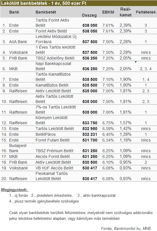 A Bankmonitor.hu friss összesítése szerint az egyéves forint lekötések közt az aktív bankkapcsolatot feltételül szabó Erste Bank „Tartós forint” aktív betétje vezeti a listát 7,61 százalékos kamattal. A forintbetétek közt a legmagasabb feltétel nélkül elérhető betét az Volksbank „1 éves tartós lekötött betétje”, ez 7,5 százalékot ígér egy éves lekötésre. Az előbbi feltételes betétre a reálkamat az MNB inflációs becslése* alapján 2,39 százalék, az utóbbi feltétel nélküli betétekre 2,28 százalék.