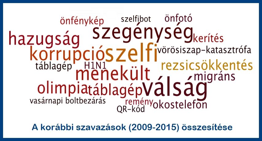 Az idén már nyolcadik alkalommal gyűjti a szavakat kiadó a honlapján. Mit fognak mutatni a 2016. évre jellemző szavak? Fordult a világ? Jobb lett-e, mint a múlt években? Az utóbbi néhány esztendő nem éppen kedvező fogalmakból álló szógyűjtéséből a „győztesek”: H1N1 influenza (2009), vörösiszap-katasztrófa (2010), végtörlesztés, leminősítés (2011), korrupció (2012), rezsicsökkentés (2013), internetadó, szelfi (2014),migráns, kerítés (2015).