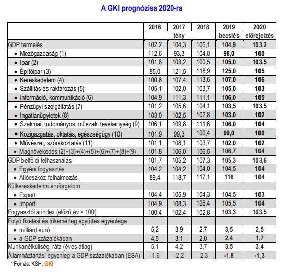 Végeredményben a GDP növekedése a GKI előrejelzése szerint 2019-ben 4,9%, 2020-ban 3,2% lesz, a beruházások 16, illetve 5%-kal, a lakosság fogyasztása 4,5, illetve 4%-kal emelkedik. A foglalkoztatás már csak kissé, a 2019. évi 0,8% után 2020-ban legfeljebb 0,5%-kal nő, a munkanélküliség 3,5% körül marad, ami a közmunkások beszámítása esetén is kedvezőbb az EU átlagánál.