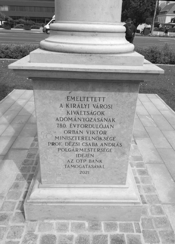 Sorolhatnánk még napestig a hasonló, elszomorító és bicskanyitogató példákat. Félő, hogy (némi túlzással) ezeregyedik alkalommal sem válaszolna kérdéseinkre a győri városháza. Így hát búcsúzzunk felejthető polgármesterétől úgy, miként ő szokott mutogatni eleve okafogyott „győzelemjelével”. És ne feledkezzünk el ennek a kőoszlopnak a polgármesteri iroda felé néző oldaláról: