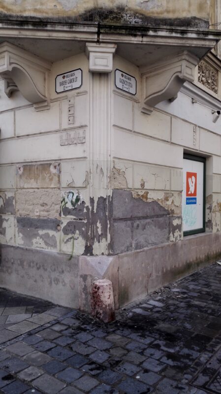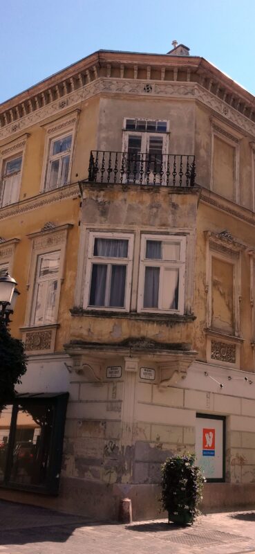És még mindig a Baross utca. Eladósorba került (végre) a Matias második szomszédja (éppen szemben a Patioval), a 8. számú épület. A valaha csinos házat nagyon megviselték a múlt évtizedek, olyannyira, hogy mára csak egy lábbelibolt viseli el a fölötte lévő két emelet omladozó terhét.