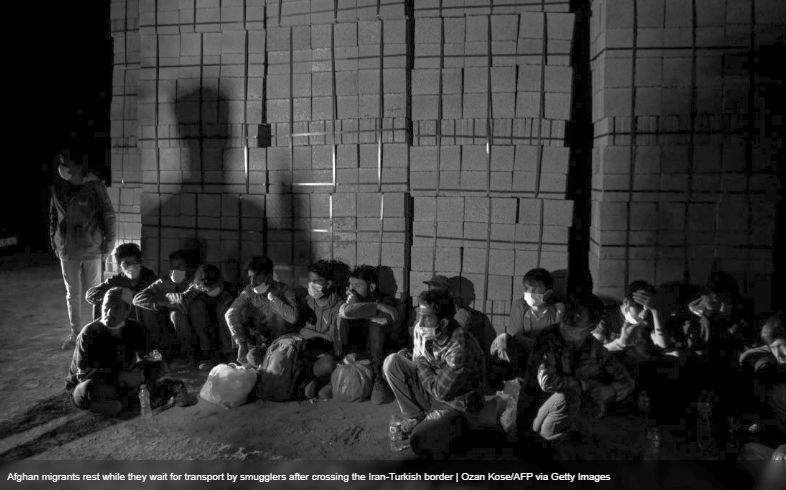 Afgán migránsok őket elszállító embercsempészekre várnak, miután átlépték az iráni–török határt (Kép: Ozan Kose/AFP/Getty Images)