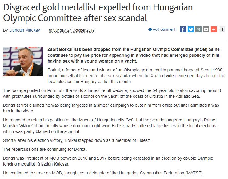 A brit szerkesztésű, olimpiai Játékokra szakosodott lap, az Inside The Games Borkai Zsolt szexbotrányáról ír, aminek következtében a napokban kizárták az Magyar Olimpia Bizottságból, sőt, a vízilabdázó olimpiai bajnok, Steinmetz Ádám politikus törvényben követeli, hogy vonják meg tőle a mintegy 300 ezer forintos olimpiai járadékot is. A vitában Orbán a döntés felelősségét Szabó Tünde miniszterre hárította, aki elmondta: csak azoktól vonható meg, akik bűncselekményt követtek el. A lap megjegyzi, a botrány óta nem mutatkozik Borkai Zsolt, a botránya ellenére – igaz, hajszálnyi többséggel – újra megválasztott győri polgármester.