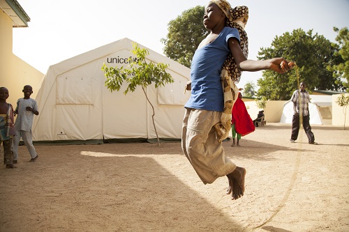 Egy lány ugrókötelezik a maiduguri tranzitközpontban, a nigériai Borno államban. Az UNICEF és Nigéria kormánya gondoskodik a táborban azon gyermekek és családjaik ellátásáról, akik otthonuk elhagyására kényszerültek a Boko Haram krízis miatt.