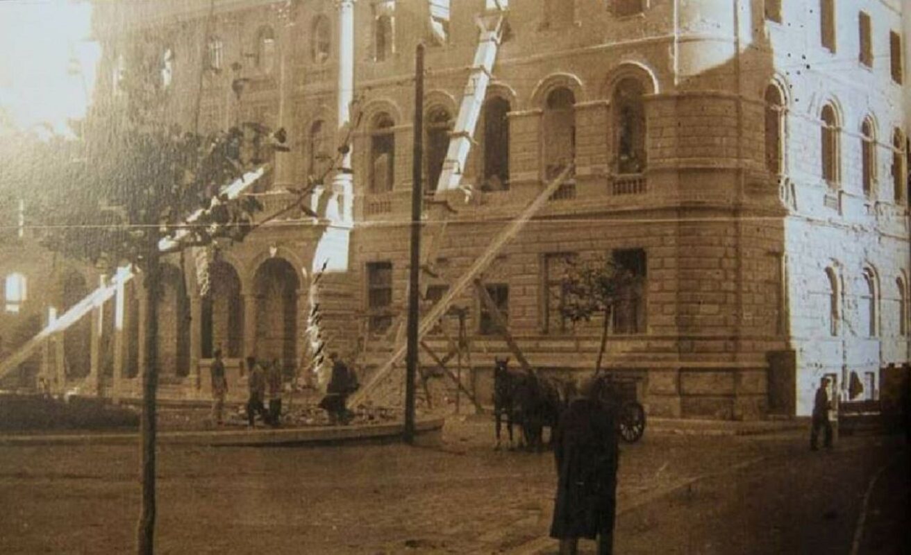 Az 1945-i bombatalálat utáni állapotok: a főfalak az épület kétharmad részében a főpárkány magasságáig épen maradtak: a hatalmas tömb visszaépíthető állapotban volt.