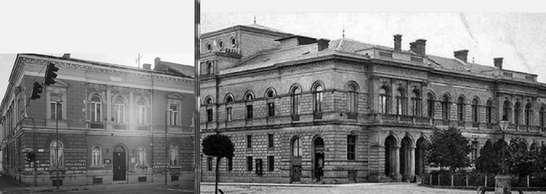 A képpár bal oldali eleme az Osztrák-Magyar Bank épületét mutatja, ami játékos, kicsinyített változata a volt színház és városháza épülettömbjének.