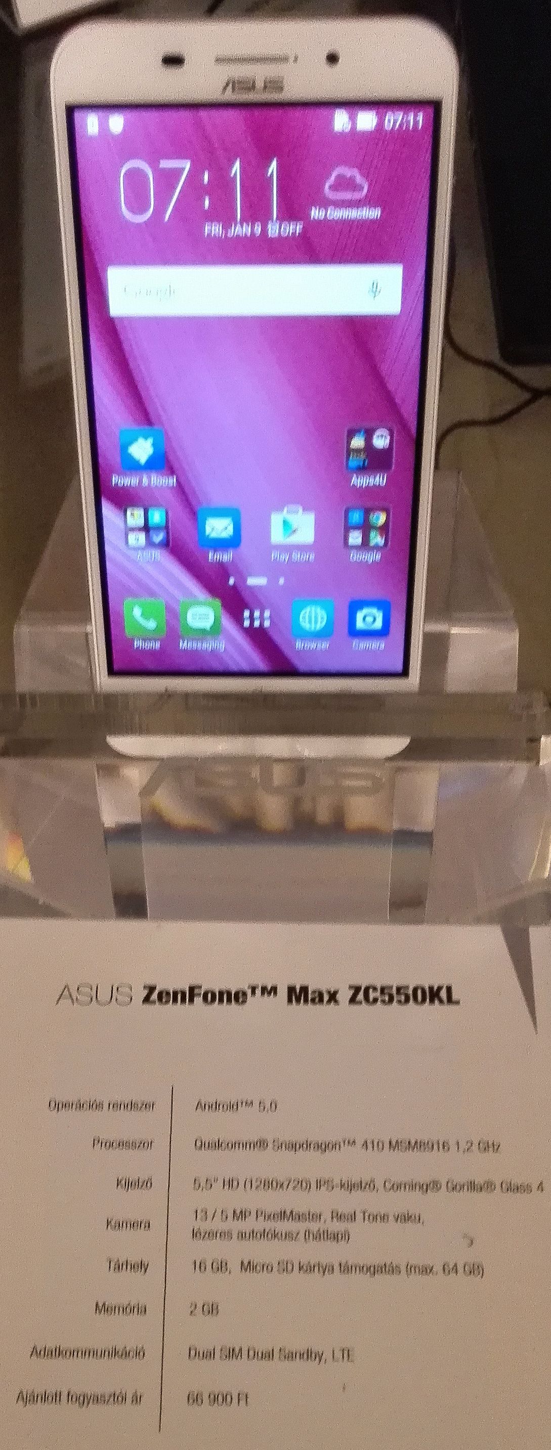 Gyepes Máté bemutatóján szerepelt a ZenFone Max okostelefon is, amely 5000 mAó-s akkuja (nagyobb, mint akárhány táblagépé!) miatt sokkal izmosabb, mint az önfényképező célgép. Ez is 5,5 hüvelyk képátlójú, meglehetősen kis energiaigényű platformmal, ám meglepően hosszú, akár háromnapos üzemidővel. Két sim-kártyás telefon, és szükség szerint (kábelen keresztül) akár erőműként (power bank) is használható, ha egy másik készülék már ájuldozik.