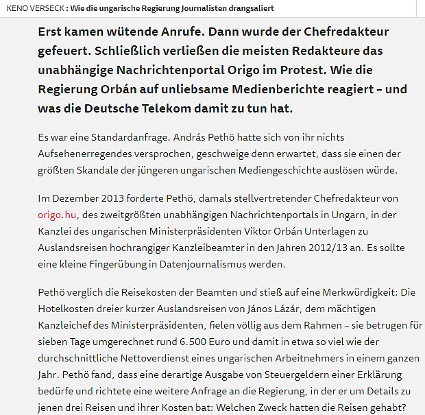 A tavaly alakult német közösségi online-újság, a krautreporter.de az Origo példáján mutatja be, miként zaklatja Magyarországon a hatalom a sajtót. Az utóbbi idők legnagyobb hazai médiabotránya azzal kezdődött, hogy a 2. legnépszerűbb internetes hírportál, az Origo főszerkesztő-helyettese adatokat kért magas rangú kormánytisztviselők külföldi útjairól… A következmény a bírálók szerint az volt, hogy alighanem a miniszterelnökség első emberének nyomására leváltották a szerkesztőség vezetőjét, majd szolidaritásból távozott a munkatársak többsége…