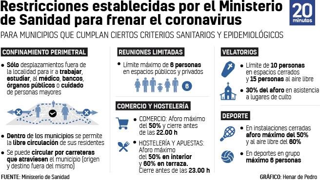 A szükségállapot kihirdetésével bevezethető lett a kijárási korlátozás Madridban. A kormány hangsúlyozta, hogy nem akarnak a már múlt pénteken kihirdetett szigorításokon túl más előírásokat bevezetni. Ez azt jelenti, hogy továbbra is Madrid központját, illetve 9 környékbeli várost (Getafét, Fuenlabradát, Alcorcónt, Alcobendast, Parlát, Torrejón de Ardozt, Alcalá de Henarest, Leganést és Móstolest) érinti a rendelkezés.