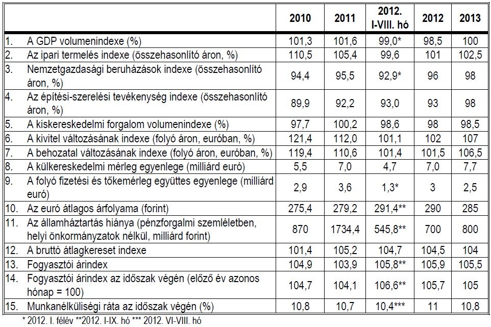 A kormányzat által bejelentett 2013-as költségvetési kiigazítás szerkezete – ennek keretében az adóemelések, s különösen a bankadó megígért megfelezésének elhalasztása – nagymértékben rontja az üzleti környezetet. A jogbiztonság további megroppanása, a belföldi kereslet szűkülése, a hitelezés várható újabb, immár a folyó gazdálkodást is veszélyeztető visszaesése paradox módon több kárt okoz, mint amennyi előny egyes munkavállalói csoportok foglalkoztatásának olcsóbbá válásától remélhető. Így a foglalkoztatás továbbra is csak statisztikailag – mindenekelőtt a közmunka további bővítése révén – bővül, a versenyszférában tovább szűkül. A belföldre termelő és szolgáltató ágazatok teljesítménye visszaesik. Azt, hogy a stagnálásnál kissé kedvezőbb vagy rosszabb lesz a gazdaság teljesítménye, lényegében az időjárás, s ezen keresztül az agrárszektor határozza meg.