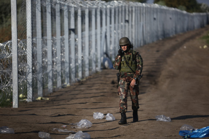 A Hungarian soldier patrols the fence on the border with Serbia | Christopher Furlong/Getty Images