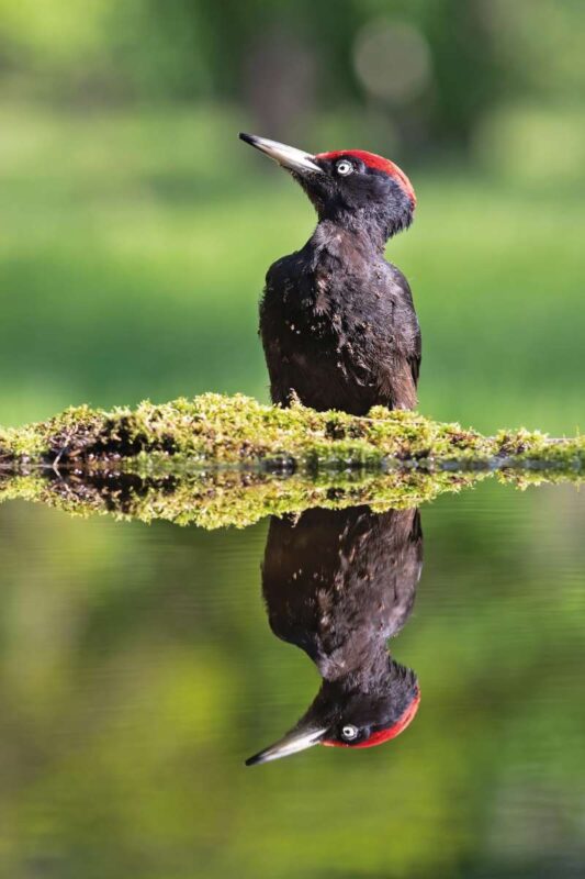Rikácsoló forgácsoló – A hazai harkályfélék legnagyobbika nemcsak méretével és tűzpiros fejbúbjával tűnik ki. A fekete harkály élő vésőgépként perforálja az erre alkalmasnak ítélt faegyedeket Fotó: Habarics Béla
