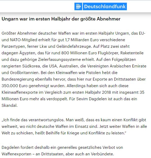 Magyarország volt a legnagyobb fegyvervásárló Németországban – mutatják az első féléves statisztikák, amiről a Deutschlandfunk számolt be. Az 1700 millió eurós üzletet a második helyen álló Egyiptom követi, összességében pedig a most bekért hivatalos adatok szerint már 7500 millió eurós üzletet ütöttek nyélbe, pedig még csak hat hónap adatait összesítették, miközben tavaly egész évben alig érte el az 5000 milliós összeget. A kisméretű lőfegyverek eladása a tavalyihoz képest megduplázódott, ami igencsak aggasztó – vélte az adatokat elemző baloldali német képviselő, Sevin Dagdelen.