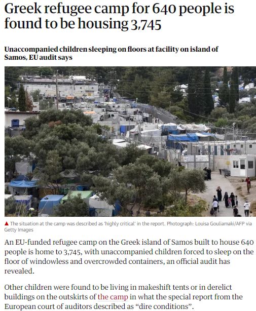 Szörnyű állapotokról számolt be az EU Számvevőszéke a menekülthelyzetet összegző jelentésében, amiről a The Guardian adott hírt. Görögországban 700 fős helyen csaknem négyezren vannak összezsúfolva, a gyerekek a földön alszanak és ablak nélküli helyiségekben töltik napjaikat. Sok a magára hagyott, egyedül bolyongó gyerek is, aki szintén mostoha körülmények között kénytelen meghúzni magát, mert az Európai Unió nem segítette a Szíriából, a polgárháború elől elmenekült bevándorlókat. Ahhoz képest, hogy a legválságosabb pillanatokban 160 ezer menekült befogadását ígérte Brüsszel, jóval kevesebbet vállalt be. Magyar-, Lengyel- és Csehország pedig szinte egyáltalán nem, miközben Olasz- és Görögország az erején felül teljesít, azonban a források fogytán. A tábori körülmények egyre rosszabbak, számos helyen nincsenek tisztálkodási lehetőségek, állandó a rettegés vagy a tűztől vagy az esők okozta áradások miatt. Nem ritkák az erőszakos cselekedetek a táboron belül, ahol a fiatal lányokat is bántalmazzák. Az ügyintézésben pedig éves lemaradásokkal küszködnek, ezért van az, hogy sokan már négy éve várják az engedélyt, hogy a sorsukról döntsenek.