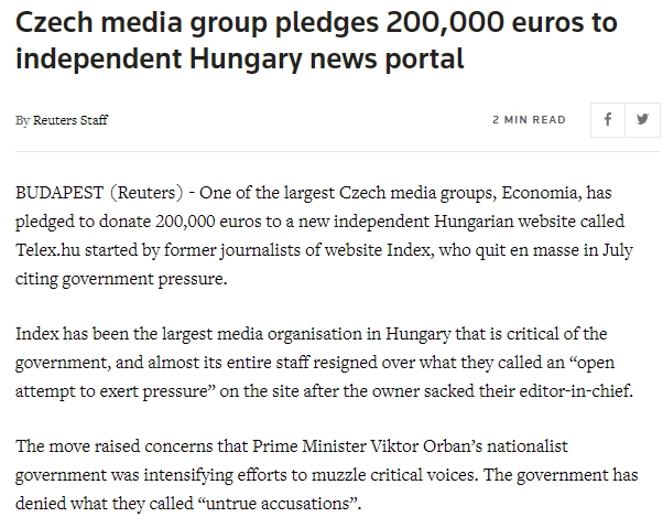 A londoni székhelyű Reuters hírügynökség beszámol arról, hogy az egyik lenagyobb cseh médiavállalkozás, az Economia 200 ezer eurót adományoz az újonnan indult magyar független hírportálnak, a Telex.hu-nak, amelyet az Index volt újságírói hoztak létre.