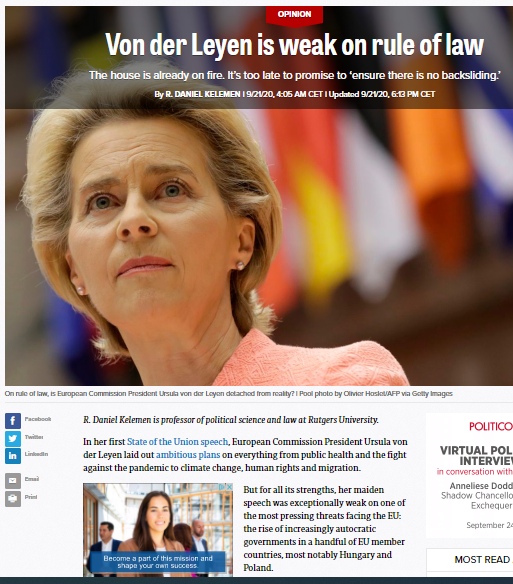 Ursula von der Leyent gyengének minősíti a jogállamiság ügyében Daniel Kelemen, az amerikai Rutgers Egyetem politikatudományi és jogi professzora a Politico című amerikai portál európai kiadása számára írt cikkében. Megfogalmazása szerint „a ház már lángokban áll”, és túl késő van ahhoz, hogy azt ígérjék, meg fogják akadályozni a dolgok rosszabbra fordulását.