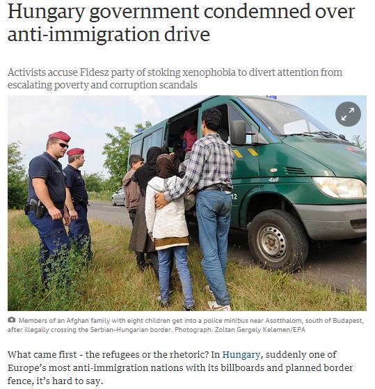 Nehéz megmondani, hogy mi volt előbb Magyarországon: a menekültek-e vagy az őket elítélő retorika-e, azt mindenesetre a plakátok és az acélkerítés miatt egyszeriben a magyar lett az egyik leginkább bevándorlásellenes nemzet Európában – olvasható a Guardianben. A közhangulat egy év alatt a migránsok ellen fordult, áprilisban 46% sorolta magát a bevándorlás elleni táborba, vagyis nagyjából 25 év alatt megháromszorozódott ez az érték. Az idegengyűlölet megerősödése egybeesett a hatalom kampányával, amelynek célja az ellenzék szerint az, hogy elvonja a figyelmet a mind nagyobb szegénységről és a vesztegetési botrányokról. Emellett azt is ellensúlyozni hivatott, hogy a Fidesz visszaszorul a Jobbikkal szemben. László Róbert a Political Capitaltől emlékeztet arra, hogy tavaly még csak a megkérdezettek 3%-a tartotta fontosnak a bevándorlás ügyét, de biztos, hogy jelenleg ez az arány lényegesen magasabb – feltételezhetően a kormánynyilatkozatok folytán. Ezt tükrözi a sok bejegyzés mostanság a közösségi oldalakon is.