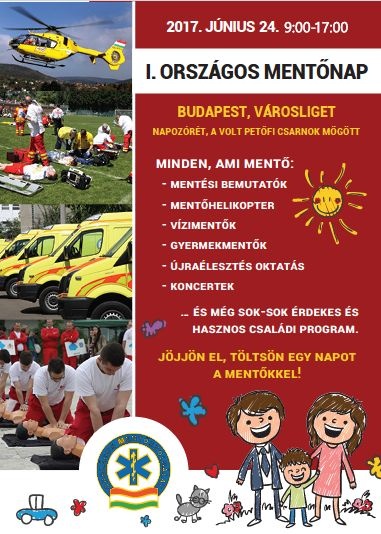 Június 24-én, azaz szombaton rendezik meg az I. országos mentőnapot Budapesten, a Városligetben. A volt Petőfi Csarnok melletti Napozórét színpadán 10 óra 30-kor a mentők ünnepi külsőségek között veszik át a Generali Biztonságért Alapítvány adományát, négy vadonatúj mentőautót, majd 11 órakor nagyszabású mentési bemutatók kezdődnek a mentőhelikopter bevetésével.