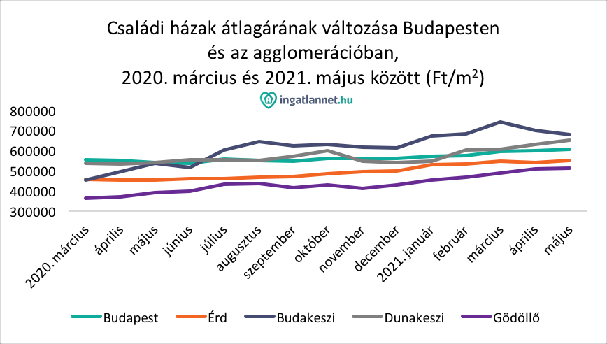 Az agglomerációban még nagyobb léptekkel emelték a családi házak átlagárait az eladók: 2020. március–2021. május között Érden és Dunakeszin átlagosan ötödével nőttek árak. Az érdi házak átlagos kínálati ára 550 ezer Ft/m2, a dunakeszieké pedig 650 ezer Ft/m2 lett.