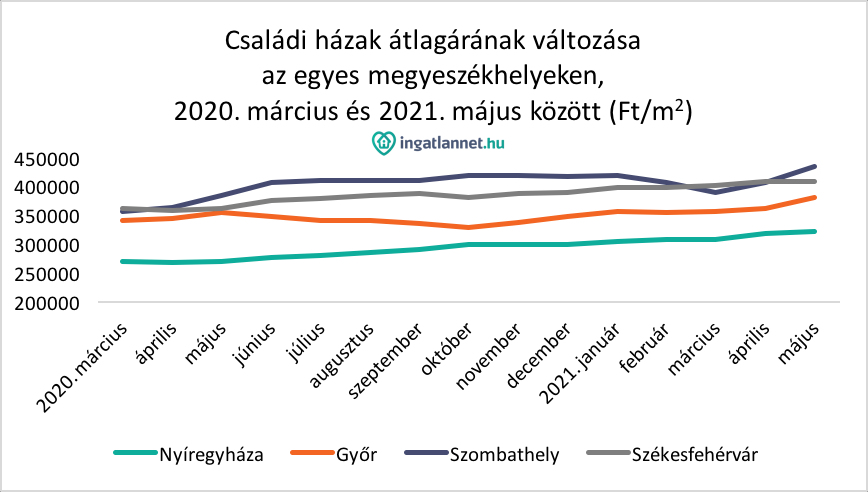 A vizsgált időszakban átlag 10% körüli áremelkedés volt megfigyelhető a győri és székesfehérvári házak esetében. Így a harmadik hullám végére, 2021 áprilisára, Győr eladó házainak átlag kínálati ára 380 ezer Ft/m2-re, Székesfehérvár eladó házainak átlag kínálati ára pedig 410 ezer Ft/m2-re tornázódott fel. Nyíregyházán és Szombathelyen átlagosan 20% körüli volt a családi házak drágulásának mértéke a három hullám alatt. Ennek következtében a nyíregyházi házak 2021 áprilisi átlaga 320 ezer Ft/m2, a szombathelyieké 440 ezer Ft/m2 lett.