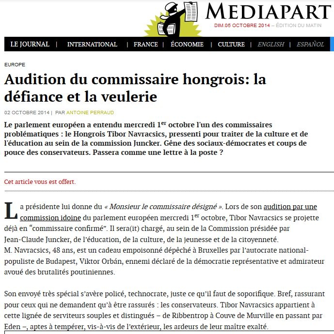 A magyar biztosjelölt meghallgatása: kihívás és erkölcsi erélytelenség. Ezzel a címmel foglalja össze a Mediapart politikai portál a problematikusnak minősített Navracsics Tibor strasbourgi szereplését, hozzátéve, hogy a szociáldemokraták zavarban vannak, a konzervatívok támogatják. Kérdés ezek után, hogy úgy megy át a vizsgán, mint kés a vajon?