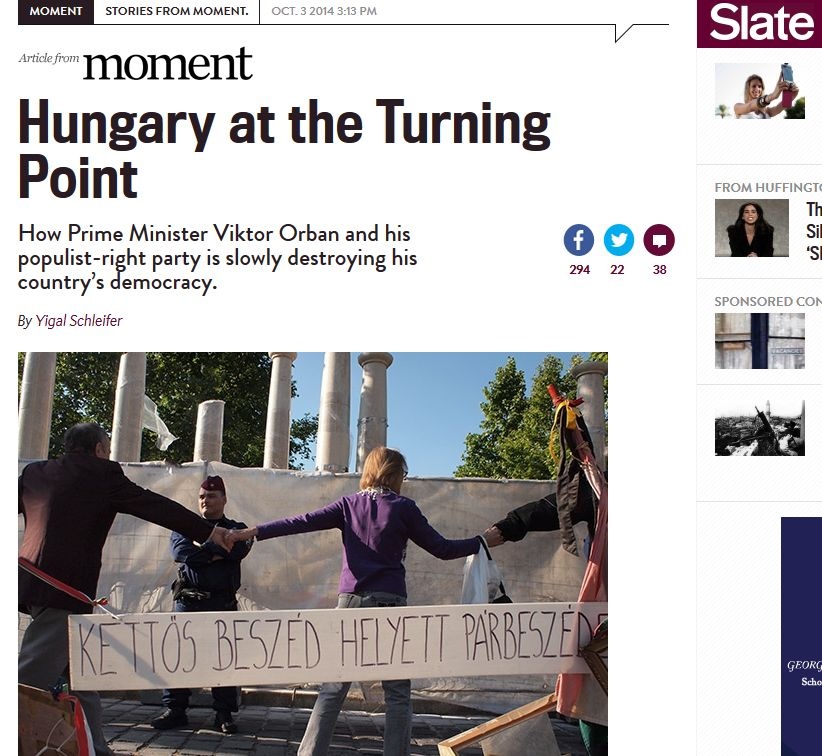 A szerző az EP-választások előtt érkezett Budapestre, és az elképesztően sok kormánypárti reklám a 80-as évek Romániájára emlékeztette, ahol minden hirdetés Ceausescu érdemeit zengte. A párt áprilisban megnyerte a parlamenti választásokat, de a győzelemnek megvolt az ára – tájékoztat a Slate.