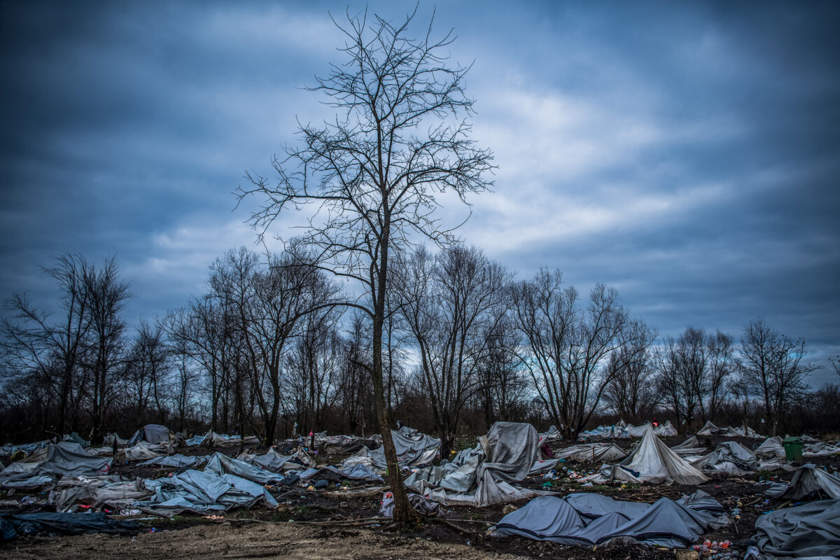 A felszámolás alatt álló, Bihácshoz közeli vucjaki tábor 2019. december 11-én. A horvát határhoz közeli táborban sátorozó migránsokat előző nap szállították el a boszniai hatóságok a táborban fennálló élhetetlen körülmények, a víz és az alap szükségletek hiánya miatt. Több száz migránst szállítottak a táborból az ország más befogadóközpontjaiba.