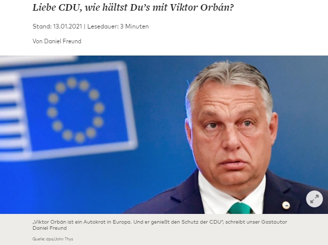 „Kedves CDU, hogyan állsz Orbán Viktorral?” – ez Freund írásának a címe. A szerző szerint a magyar miniszterelnök már régóta gondot jelent az EU számára, miként a Fidesz-képviselők is a konzervatív Európai Néppárt számára. A CDU Angela Merkel utáni új elnökének döntést kell hoznia arról, hogy pártja továbbra is oltalmazni kívánja-e őket – vélekedik Daniel Freund.