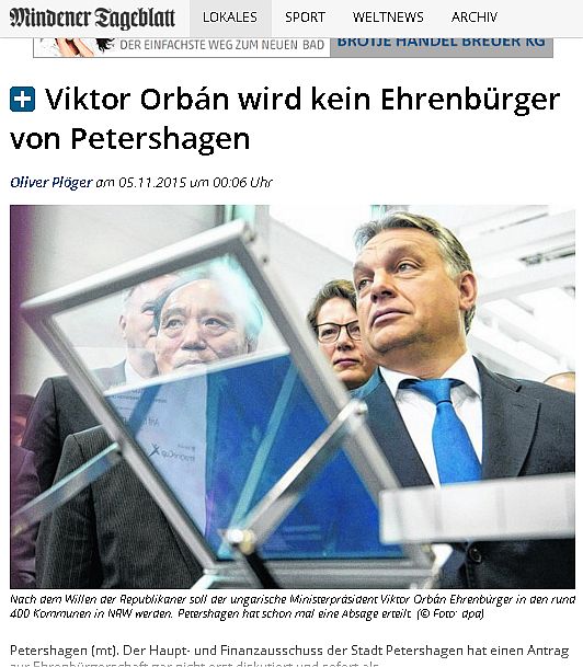 Nem lesz díszpolgár az észak-rajna–wesztfáliai Petershagenben Orbán Viktor – írja két cikkében is a Mindener Tageblatt. A 25 ezer lakosú településen a republikánusok, vagyis az ottani szélsőjobb tagjai vetették fel, hogy az elismeréssel kellene adózni a magyar miniszterelnök érdemeinek, ám az önkormányzat illetékes bizottsága azonnal, vita nélkül elutasította a javaslatot, mondván, hogy az megengedhetetlen.