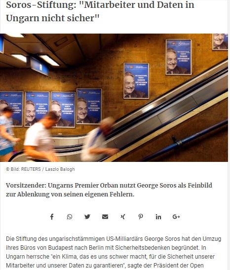 Az osztrák Kurier szerint Orbán azért kampányol még mindig Sorossal, hogy saját zűrös ügyeiről elvonja a figyelmet. A Soros Alapítvány berlini vezetője elpanaszolta, hogy nem voltak biztonságban sem a dolgozóik, sem azok az információk és munkák, amelyeken dolgoztak, ezért döntöttek úgy, hogy Budapestet elhagyva Berlinbe költözik az alapítvány.