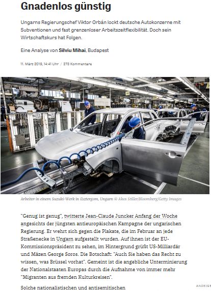Végül röviden arról, hogy a Die Zeit című német magazin internetes változata igen alaposan körüljárja a magyarországi munkapiaci feltételek kérdését, és megállapítja: miközben az európai politika elutasítóan reagál a magyar kormány gyűlöletkampányára, sok európai, elsősorban német nagyvállalat továbbra is igen kedveli Magyarországot, hiszen Orbán úgymond „kegyetlenül kedvező” feltételeket teremt számukra, szubvenciókat és csaknem korlátlan munkaidő-rugalmasságot biztosít az autógyártóknak. Ennek a gazdasági kurzusnak azonban megvan az ára, munkaerő kivándorol – figyelmeztet a Die Zeit.