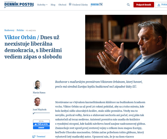 Mivel megúsztam Orbán szokásos péntek reggeli álinterjújának meghallgatását a Magyar Rádióban, elmerültem egy sokkal érdekesebb, valódi interjúban, amit Orbán a szlovák Postoj konzervatív napilapnak adott. Azt mondta, hogy ideje volt interjút adni egy szlovák lapnak, hiszen legutóbb 2009-ben a Týždeň című konzervatív hetilap újságíróival beszélt.