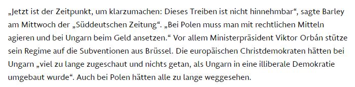 De a politikus még ennél is fontosabbnak tartja, hogy a következő pénzügyi időszaktól a brüsszeli anyagi támogatások korlátozásához vezessen, ha bármelyik ország megszegi a demokratikus normákat. Az Európai Bíróság egyébként árgus szemekkel követi, nem avatkozik-e be valahol a hatalom az igazságszolgáltatás önállóságába.