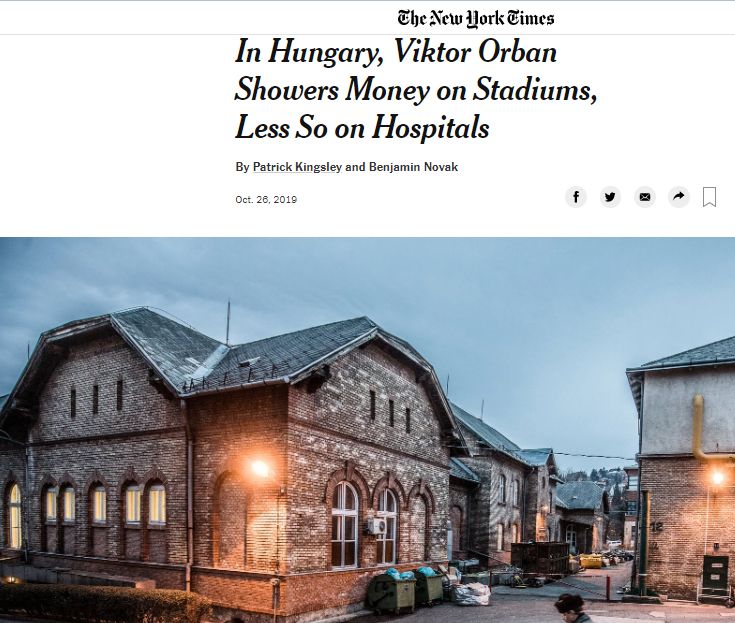 Magyarországon ragyognak a stadionok, a kórházak viszont pusztulnak, mivel Orbán Viktor az előbbi célra két kézzel szórja a pénzt, utóbbira viszony már nem annyira –írja a The New York Times.