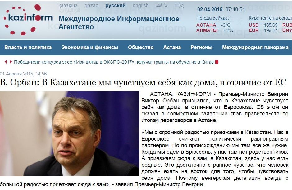 A szokatlanul népes, mintegy száztagú küldöttség élén Kazahsztánba érkezett magyar kormányfő a Kazinform nemzetközi tájékoztatási ügynökség orosz nyelvű honlapján közzétett tudósítás szerint kijelentette: