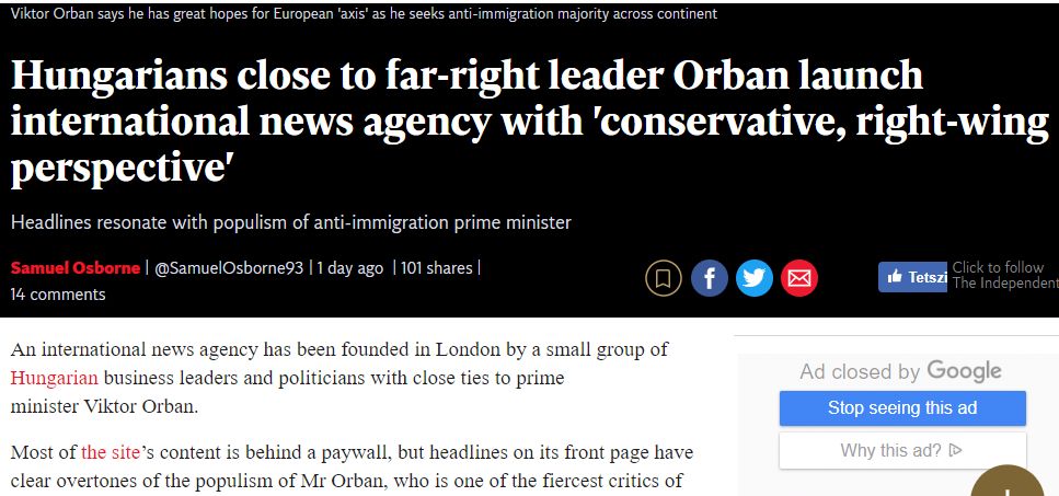 A magyarok európai hírügynökséget hoztak létre Orbán-párti tartalom előállítással – számol be a Voice of America, de rajta kívül rengeteg más forrást is megjelölhetünk e témában, ami mellett nem megy el szótlanul a külföldi sajtó. A francia Le Monde például úgy fogalmazott, hogy létrejött a világ első fizetős külföldi hírügynöksége fake news-tartalmak előállítására. Orbán számára problémát okozott, hogy a nemzetközi sajtóra nem tudott befolyást gyakorolni, márpedig az különösen kritikus a magyar kormányfővel szemben és a kormányzati intézkedések miatt is.