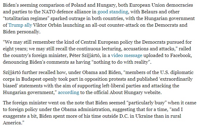 Joe Biden ugyanis a totalitáriánus rendszerekről beszélt, és ebbe a mondatba fűzte az összehasonlítást. Sőt, azt is hozzátette, hogy Trump jó barátjának tekinti ezen országok, illetve a világ összes országának önkényurát, akit egyenesen banditának is hívott. Majd a Breibart részletesen ismerteti Szijjártó Péternek erre reagáló, a Facebookon videóüzenet formájában megjelent felháborodását, illetve a Biden és fia elleni támadását.