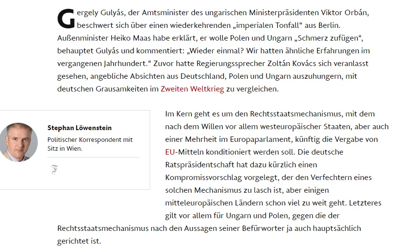 A Frankfurter Allgemeine Zeitung összeszedte azokat a fenyegetéseket és vádaskodásokat, amelyeket a magyar kormány emberei üzentek meg német vezetésnek, elsősorban az szociáldemokraták vezető politikusainak – annak kapcsán, hogy az uniós soros elnökséget betöltő Németország is pénzügyileg kiéheztetné Magyar- és Lengyelországot – válaszul a jogállami normák megsértésére. Gulyás Gergely úgy fogalmazott, hogy elfogadhatatlan a birodalmi hangvétel, amit nem fog eltűrni a magyar kormány. Kovács Zoltán pedig odáig ment, hogy a II. világháborús német birodalmi politikával vont párhuzamot, mert a mostani támadások szerinte olyanok, mint annak idején a Varsó és Sztálingrád elleni német ostrom.