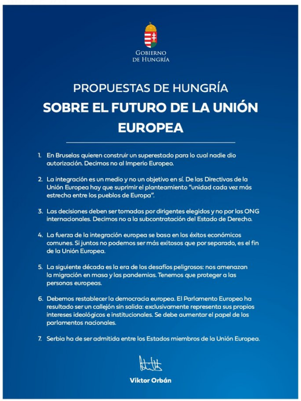 Orbán Viktor hét javaslatot fogalmaz meg – angolul – „az Európai Unió jövőjéről”. Brüsszelben egy olyan szuperállamot építenek, amelyre senki sem adott felhatalmazást. Nemet mondunk az európai birodalomra – áll az első javaslatban. Orbán Viktor a hirdetésben azt írja, hogy szeretné, ha Szerbia csatlakoznék az EU-hoz, az Európai Parlamentet „zsákutcának” nevezi, majd kijelenti, hogy az európai integráció “eszköz, nem öncél”. „Nemet mondunk az európai birodalomra” – írja a valószínűleg a magyar költségvetésből (a magyar emberek pénzéből finanszírozott) hirdetésben. A hirdetésben nem azt írja, hogy mi Orbán Viktor véleménye, hanem azt, hogy mi a magyarok véleménye.