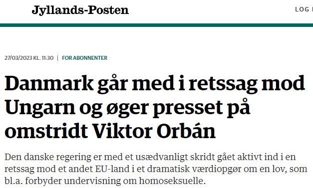 „Dánia is csatlakozik a Magyarország elleni bírósági eljáráshoz, növelve a nyomást az ellentmondásos Orbán Viktorra Szokatlan módon a dán kormány aktív szerepet vállalt egy másik uniós országgal szembeni bírósági perben, amely a melegoktatást tiltó törvény miatti drámai leszámolásban zajlik. Dánia csatlakozik a Magyarország elleni bírósági eljáráshoz, növelve a nyomást az ellentmondásos Orbán Viktorra egy olyan látványos ügyben, amely az alapvető európai értékek összecsapásává vált. Lars Løkke Rasmussen külügyminiszter bejelentette, hogy a dán kormány megtette azt a ritka lépést, hogy aktívan támogatja az Európai Bizottság által Magyarország ellen az Európai Bíróság előtt indított eljárást…”