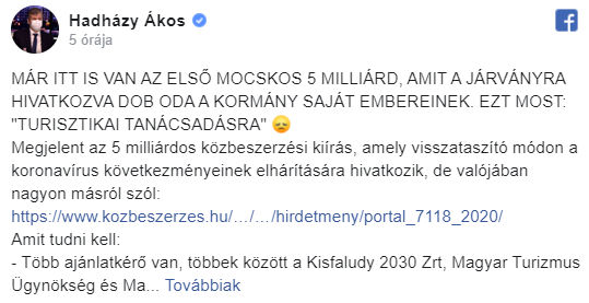 (Forrás: 168ora.hu) „Tanácsadás a koronavírus okozta károk mérséklésére” címmel jelent meg egy ötezermillió forintos, turisztikai témájú közbeszerzési kiírás, amiről Hadházy Ákos független parlamenti képviselő írt a Facebookon. A kiírást a 444.hu vette észre.