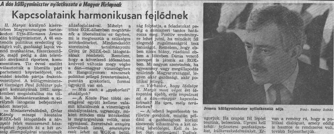 (1987. október 13.) II. Margit királynő kíséretében Magyarországon tartózkodott Uffe-Ellemann Jensen dán külügyminiszter. A 46 esztendős politikus eredetileg újságíró volt, gazdasági lapok vezető munkatársa, főszerkesztője, majd pedig a dán televízió szerkesztő riportere, kommentátora. Tíz évvel ezelőtt választották a liberális párt parlamenti képviselőjévé, röviddel később pártja frakcióvezetőjévé. A külügyminiszteri tisztséget Poul Schlüter polgári kormányának 1982. szeptemberi megalakulása óta tölti be. Munkatársunknak a királynői látogatás befejeztével adott interjút.